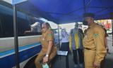 Petugas kesehatan dari Puskesmas Larangan membantu calon penumpang bus Trans Jakarta mengikuti tes GeNose 19, di Halte Bus Trans Jakarta Koridor 13 Puri Beta, Larangan, Tangerang, Banten, Senin (24/5/2021). Tes GeNose 19 gratis yang diadakan Pemkot Tangerang bagi penumpang bus yang akan dan dari Jakarta ini bertujuan untuk mendeteksi serta menjegah penyebaran dan penularan COVID-19. (FOTO : Antara/Muhammad Iqbal)