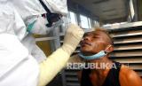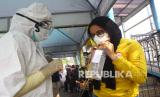 Petugas kesehatan dari Puskesmas Larangan melakukan tes PCR kepada warga yang kedapatan reaktif COVID-19 saat mengikuti tes GeNose 19, di Halte Bus Trans Jakarta Koridor 13 Puri Beta, Larangan, Tangerang, Banten, Senin (24/5/2021). Tes GeNose 19 gratis yang diadakan Pemkot Tangerang bagi penumpang bus yang akan dan dari Jakarta ini bertujuan untuk mendeteksi serta menjegah penyebaran dan penularan COVID-19. (FOTO : Antara/Muhammad Iqbal)