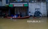 REPUBLIKA.CO.ID, BANDUNG -- Seorang lansia menaiki perahu saat banjir melanda Kampung Bojongasih, Dayeuhkolot, Kabupaten Bandung, Jawa Barat, Selasa (25/5). Banjir luapan Sungai Citarum akibat intensitas hujan yang tinggi pada Senin (24/5) sore hingga malam hari tersebut menyebabkan empat kecamatan di Kabupaten Bandung terendam banjir setinggi 50 sentimeter hingga dua meter.
