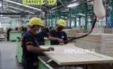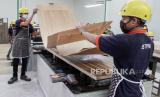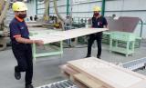 Pekerja memindahkan pintu kayu produksi PT. Woodone Integra Indonesia di Krian, Sidoarjo, Jawa Timur, Selasa (25/5/2021). Kementrian Perindustrian menargetkan PT. Woodone Integra Indonesia memproduksi 100 ribu pengolahan kayu (woodworking) pintu dari kayu dan komponen bahan bangunan dari kayu yang meliputi wooden step, pintu kayu, stair riser, kusen kayu, list kayu atau architrave dan plinth kayu atau skirting per bulan pada tahun 2023. ANTARA FOTO/Umarul Faruq/rwa. (FOTO : ANTARA FOTO)
