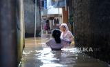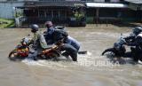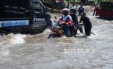 REPUBLIKA.CO.ID, BANDUNG -- Anak-anak membantu pengendara sepeda motor yang mogok di Jalan Raya Dayeuhkolot, Kabupaten Bandung, yang terendam banjir Sungai Citarum, Selasa (25/5). Tingginya intesitas hujan di Bandung Raya, menyebabkan debit air Sungai Citarum kembali naik dan merendam hampir seluruh wilayah bantaran Sungai Citarum.