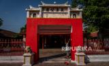 Pekerja mengecat gapura Kelenteng Gie Yong Bio yang didirikan sekitar tahun 1780 di Lasem, Kabupaten Rembang, Jawa Tengah, Selasa (25/5/2021). Kemendikbud Ristek berkolaborasi dengan Yayasan Lasem Heritage bersama Tim Ahli Cagar Budaya (TACB) Nasional, Balai Pelestarian Cagar Budaya, Pusat Dokumentasi Arsitektur Indonesia, akademisi serta berbagai komunitas masyarakat setempat melakukan kegiatan Survei Pendataan Objek Diduga Cagar Budaya di Lasem pada 24 hingga 28 Mei 2021 mendatang sebagai upaya merekomendasikan penetapan sejumlah area di Kecamatan Lasem menjadi Kawasan Cagar Budaya Nasional. (FOTO : ANTARA/AJI STYAWAN)
