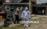 Tim Vaksinasi dan Testing, Tracing, Treatment (3T) COVID-19 Polresta Pekanbaru disemprot cairan disinfektan usai melakukan swab antigen serta vaksinasi kepada warga yang kontak erat dengan warga yang positif COVID-19 di Pekanbaru, Riau, Rabu (26/5/2021). Kegiatan tersebut dilakukan guna mecegah penularan serta mempercepat program vaksinasi secara menyeluruh ke semua lapisan masyarakat. (FOTO : Antara/Rony Muharrman)