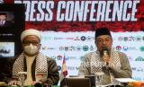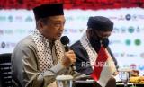 Pimpinan AQL Islamic Center KH Bachtiar Nasir (kiri)memberikan keterangan terkait Aksi Munasharah dan Merawat Kemenangan Dari Masjid Indonesia untuk Masjidil Aqsha, Al Quds dan Palestina Merdeka di Jakarta, Jumat (28/5). Aksi dukungan terhadap pembebasan masjidil aqsha dan perjuangan kemerdekaan Palestina tersebut akan dilaksanakan pada Ahad (30/5) dimulai pukul 06.00 sd 10.00 WIB yang akan diikuti oleh ribuan masjid dari seluruh pelosok negeri.Prayogi/Republika. (FOTO : Prayogi/Republika.)