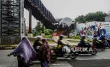 Warga menyeberangi jalan di kawasan Tanjung Barat, Jakarta, Sabtu (29/5). Progres pembangunan JPO yang berada di tengah jalan layang berbentuk tapal kuda itu sudah mencapai 90 persen dengan dilengkapi fasilitas lift untuk kesetaraan fasilitas publik bagi semua warga Ibu Kota. (FOTO : Republika/Putra M. Akbar)