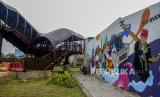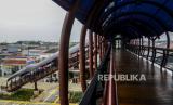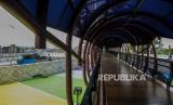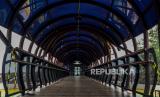 Suasana jembatan penyeberangan orang (JPO) Tanjung Barat yang masih ditutup di Jakarta, Sabtu (29/5). Progres pembangunan JPO yang berada di tengah jalan layang berbentuk tapal kuda itu sudah mencapai 90 persen dengan dilengkapi fasilitas lift untuk kesetaraan fasilitas publik bagi semua warga Ibu Kota. (FOTO : Republika/Putra M. Akbar)