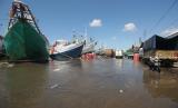 REPUBLIKA.CO.ID, SURABAYA -- Sejumlah pekerja melakukan proses bongkar muat saat terjadinya banjir rob di Pelabuhan Kalimas, Surabaya, Jawa Timur, Sabtu (29/5/2021).