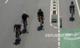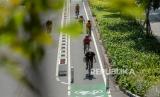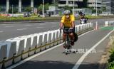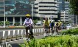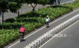 Pesepeda berada di jalur sepeda saat melintas di kawasan Sudirman Thamrin, Jakarta, Ahad (30/5). (FOTO : Republika/Thoudy Badai)