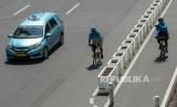 Pesepeda berada di luar jalur sepeda saat melintas di kawasan Sudirman Thamrin, Jakarta, Ahad (30/5). Direktorat Lalu Lintas Polda Metro Jaya akan menindak tegas atau memberlakukan tilang bagi pesepeda yang masih menggunakan lajur kanan di jalan umum setelah jalur khusus sepeda balap (road bike) diresmikan. (FOTO : Republika/Thoudy Badai)