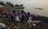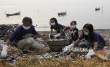 Warga memungut sampah di pinggir pantai di kawasan Kedung Cowek, Surabaya, Jawa Timur, Ahad (30/5). Aksi bersih-bersih sampah yang diinisiasi oleh Tunas Hijau itu sebagai wujud kepedulian terhadap kebersihan lingkungan di kawasan pantai yang menjadi salah satu tujuan wisata di Surabaya. (FOTO : ANTARA /Didik Suhartono)