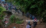 Sejumlah pengendara melintas di jalan yang longsor di Kecamatan Lebakgedong, Lebak, Banten, Ahad (30/5). Badan Penanggulangan Bencana Daerah (BPBD) Kabupaten Lebak mengatakan akses jalan sepanjang 50 meter penghubung antar Provinsi Banten-Jawa Barat tersebut longsor akibat hujan dengan intensitas tinggi yang terjadi pada Sabtu (29/5/2021). (FOTO : ANTARA FOTO/Muhammad Bagus Khoirunas)