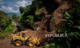 Pekerja menggunakan alat berat untuk membersihkan material longsor di Kecamatan Lebakgedong, Lebak, Banten, Ahad (30/5). (FOTO : ANTARA FOTO/Muhammad Bagus Khoirunas)