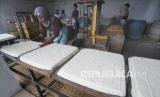 Perajin memproduksi tahu di Kampung Krajan, Mojosongo, Solo, Jawa Tengah, Ahad (30/5/2021). Menurut pengusaha tahu setempat mereka terpaksa mengurangi jumlah produksi hingga mengurangi ukuran tahu akibat naiknya harga kacang kedelai impor yang semula Rp 9 ribu menjadi Rp 10.500 per kilogram. (FOTO : ANTARA/Maulana Surya)