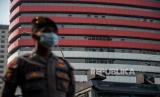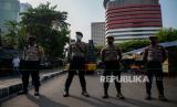 Petugas kepolisian berjaga di area Gedung Merah Putih KPK, Jakarta, Senin (31/5). Penjagaan tersebut dilakukan sebagai antisipasi gelombang aksi serta penjagaan objek vital atas polemik terkait keputusan pimpinan KPK menonaktifkan sejumlah pegawai KPK yang tak lulus Tes Wawasan Kebangsaan (TWK) dalam proses alih status menjadi Aparatur Sipil Negara (ASN). Republika/Thoudy Badai (FOTO : Republika/Thoudy Badai)