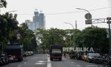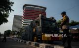 Kendaraan water cannon terparkir di area Gedung Merah Putih KPK, Jakarta, Senin (31/5). Penjagaan tersebut dilakukan sebagai antisipasi gelombang aksi serta penjagaan objek vital atas polemik terkait keputusan pimpinan KPK menonaktifkan sejumlah pegawai KPK yang tak lulus Tes Wawasan Kebangsaan (TWK) dalam proses alih status menjadi Aparatur Sipil Negara (ASN). Republika/Thoudy Badai (FOTO : Republika/Thoudy Badai)