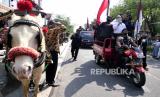 Kusir andong hormat menyambut iringan kendaraan yang memutar lagu Garuda Pancasila di kawasan wisata Jalan Malioboro, Yogyakarta, Selasa (1/6). Dalam rangka memperingati Hari Lahir Pancasila beberapa elemen masyarakat di Malioboro melakukan penghormatan saat pemutaran Lagu Indonesia Raya. Selanjutnya, memutar lagu Garuda Pancasila dan berjalan di sepanjang Jalan Malioboro. Pedagang, tukang becak, kusir andong, dan wisatawan juga ikut berdiri menyambut pemutaran lagu kebangsaan. (FOTO : Wihdan Hidayat / Republika)