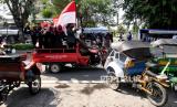 Iring-iringan kendaraan yang memutar lagu Garuda Pancasila di kawasan wisata Jalan Malioboro, Yogyakarta, Selasa (1/6). Dalam rangka memperingati Hari Lahir Pancasila beberapa elemen masyarakat di Malioboro melakukan penghormatan saat pemutaran Lagu Indonesia Raya. Selanjutnya, memutar lagu Garuda Pancasila dan berjalan di sepanjang Jalan Malioboro. Pedagang, tukang becak, kusir andong, dan wisatawan juga ikut berdiri menyambut pemutaran lagu kebangsaan. (FOTO : Wihdan Hidayat / Republika)