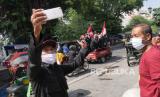 Wisatawan berswafoto menyambut iring-iringan kendaraan yang memutar lagu Garuda Pancasila di kawasan wisata Jalan Malioboro, Yogyakarta, Selasa (1/6). Dalam rangka memperingati Hari Lahir Pancasila beberapa elemen masyarakat di Malioboro melakukan penghormatan saat pemutaran Lagu Indonesia Raya. Selanjutnya, memutar lagu Garuda Pancasila dan berjalan di sepanjang Jalan Malioboro. Pedagang, tukang becak, kusir andong, dan wisatawan juga ikut berdiri menyambut pemutaran lagu kebangsaan. (FOTO : Wihdan Hidayat / Republika)