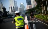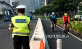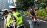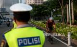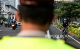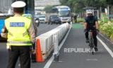 Petugas Kepolisian mengarahkan pesepada untuk berada di jalur khusus sepeda saat melintasi kawasan Sudirman-Thamrin, Jakarta, Rabu (2/6). Wakil Gubernur DKI Jakarta Ahmad Riza Patria memperbolehkan pesepeda jenis road bike untuk melintas di lajur kanan di jalur umum Jalan Sudirman-Thamrin pada hari kerja Senin-Jumat pada jam khusus pukul 05.00-06.30 WIB. (FOTO : Republika/Thoudy Badai)