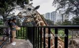 Sejumlah pengunjung memberi pakan jerapah di Bandung Zoological Garden, Kota Bandung, Rabu (2/6). Pemerintah Kota Bandung membuka kembali enam tempat wisata mulai 2 Juni 2021 setelah ditutup sejak 23 Mei 2021 guna mengantisipasi potensi kerumunan yang dapat menyebarkan Covid-19. Foto: Republika/Abdan Syakura (FOTO : REPUBLIKA/ABDAN SYAKURA)