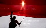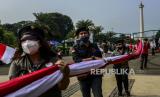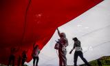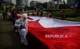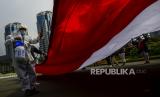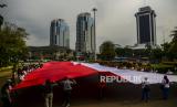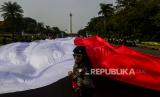 Sejumlah massa mengibarkan bendera merah putih di kawasan Patung Kuda Arjuna Wiwaha, Jakarta, Rabu (2/6). Pengibaran bendera merah putih raksasa berukuran 1.200 meter persegi itu dalam rangka memperingati Hari Lahir Pancasila dan Bulan Bung Karno yang jatuh bertepatan pada bulan Juni. (FOTO : Republika/Putra M. Akbar)