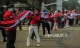 Sejumlah massa melipat bendera merah putih di kawasan Patung Kuda Arjuna Wiwaha, Jakarta, Rabu (2/6). Pengibaran bendera merah putih raksasa berukuran 1.200 meter persegi itu dalam rangka memperingati Hari Lahir Pancasila dan Bulan Bung Karno yang jatuh bertepatan pada bulan Juni. Republika/Putra M. Akbar (FOTO : Republika/Putra M. Akbar)