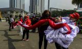 Sejumlah massa bersiap mengibarkan bendera merah putih di kawasan Patung Kuda Arjuna Wiwaha, Jakarta, Rabu (2/6). Pengibaran bendera merah putih raksasa berukuran 1.200 meter persegi itu dalam rangka memperingati Hari Lahir Pancasila dan Bulan Bung Karno yang jatuh bertepatan pada bulan Juni. Republika/Putra M. Akbar (FOTO : Republika/Putra M. Akbar)