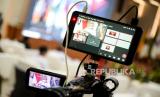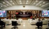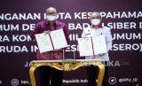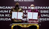 Suasana penandatanganan nota kesepahaman KPU bersama Badan Siber dan Sandi Negara (BSSN) RI dan PT Garuda Indonesia (Persero) Tbk di Gedung KPU, Jakarta, Rabu (2/6). KPU melakukan kerja sama dengan Badan Siber dan Sandi Negara (BSSN) RI melalui penandatanganan terkait dengan perlindungan informasi dan transaksi elektronik dan PT Garuda Indonesia (Persero) Tbk terkait pemanfaatan produk dan layanan dalam penyelenggara pemilu dan pemilihan. (FOTO : Republika/Thoudy Badai)