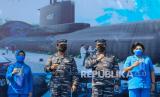 REPUBLIKA.CO.ID, Kepala Dinas Sejarah TNI Angkatan Laut Laksamana Pertama TNI Supardi memberi sambutan saat peletakan batu pertama pembangunan Monumen KRI Nanggala-402 di Koarmada II, Surabaya, Jawa Timur, Kamis (3/6/2021). Pembangunan Monumen KRI Nanggala-402 dengan ukuran berskala satu banding satu tersebut untuk mengenang gugurnya 53 kru KRI Nanggala-402.