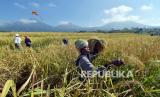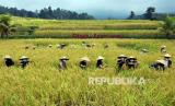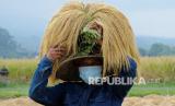 REPUBLIKA.CO.ID, TABANAN -- Petani memanggul padi merah di kepalanya saat panen raya di persawahan Jatiluwih, Tabanan, Bali, Kamis (3/6).