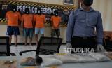 Polisi menunjukan tersangka dan barang bukti saat ungkap kasus kurir narkoba jenis sabu di Polres Sleman, Yogyakarta, Kamis (3/6/2021). Polres Sleman berhasil mengamankan empat tersangka kurir sabu asal Jawa Timur dengan barang bukti empat kilogram narkotika jenis sabu. (FOTO : ANTARA FOTO/Andreas Fitri Atmoko)