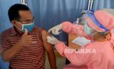 Petugas kesehatan dari Puskesmas Kecamatan Cempaka Putih menyuntikan vaksin COVID-19 kepada warga pra lansia di RPTRA Matahari, Jakarta, Jumat (6/4). Pemerintah provinsi DKI Jakarta telah mulai melaksanakan vaksinasi untuk warga pra-lansia berusia 50-59 tahun. Sebab, masyarakat dalam rentang usia tersebut juga dinilai rentan terpapar COVID-19 setelah kelompok usia 60 tahun ke atas. (FOTO : Prayogi/Republika.)