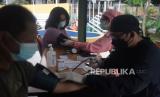 Petugas dari Puskesmas Kecamatan Cempaka Putih melakukan screening kesehatan warga pra lansia sebelum divaksin COVID-19 di RPTRA Matahari, Jakarta, Jumat (6/4). Pemerintah provinsi DKI Jakarta telah mulai melaksanakan vaksinasi untuk warga pra-lansia berusia 50-59 tahun. Sebab, masyarakat dalam rentang usia tersebut juga dinilai rentan terpapar COVID-19 setelah kelompok usia 60 tahun ke atas.Prayogi/Republika. (FOTO : Prayogi/Republika.)