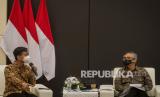 Ketua Dewan Komisioner Otoritas Jasa Keuangan (OJK) Wimboh Santoso (kanan) dan Wali Kota Solo Gibran Rakabuming Raka (kiri) memberikan pemaparan saat acara Sarasehan dan Koordinasi Pemulihan Ekonomi Solo Raya di Kantor OJK, Solo, Jawa Tengah, Jumat (4/6/2021). Acara yang diikuti Kepala Daerah di Solo Raya, Akademisi dan Otoritas Jasa Keuangan (OJK) tersebut mambahas langkah dan strategi membangkitkan kembali aktivitas ekonomi terutama di sektor Pariwisata, Perdagangan dan Industri untuk mempercepat pemulihan ekonomi. (FOTO : Antara/Mohammad Ayudha)