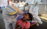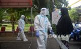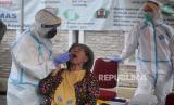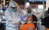REPUBLIKA.CO.ID, JAKARTA -- Petugas medis mengambil sampel lendir saat tes usap PCR kepada warga Rt 11 Rw 09 Kelurahan Kayu Putih, Kecamatan Pulogadung, Jakarta, Sabtu (5/6).