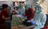 Petugas medis mendata sebelum dilakukannya tes usap PCR kepada warga Rt 11 Rw 09 Kelurahan Kayu Putih, Kecamatan Pulogadung, Jakarta, Sabtu (5/6). Sebanyak 40an warga mejalani tes usap PCR setelah sebanyak 22 orang warga dinyatakan positif COVID-19 yang diduga berasal dari kerumunan di sebuah taman yang ada di lingkungan RT 11 bernama Taman Pintar.Prayogi/Republika. (FOTO : Prayogi/Republika.)