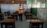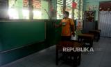 REPUBLIKA.CO.ID, JAKARTA -- Petugas Sekolah menyemprotkan disinfektan di ruang kelas SDN Petojo Utara 05 Pagi, Jakarta, Sabtu (5/6).