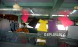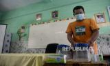 Petugas Sekolah merapikan face shield di ruang kelas SDN Petojo Utara 05 Pagi, Jakarta, Sabtu (5/6). Humas Dinas Pendidikan DKI Jakarta Taga Radja Gah mengatakan Uji coba pembelajaran tatap muka tahap II di Provinsi DKI Jakarta kemungkinan mundur dari jadwal semula pada Senin (7/6) menjadi Rabu (9/6).Prayogi/Republika. (FOTO : Prayogi/Republika.)