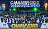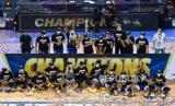 Tim Basket Satria Muda Pertamina Jakarta mengangkat piala usai memenangi laga final IBL 2021 di Britama Arena, Jakarta, Ahad (6/6). Satria Muda Pertamina Jakarta berhasil mengalahkan tim Basket Pelita Jaya Bakrie Jakarta pada game ke tiga dengan skor 68-60. (FOTO : Republika/Thoudy Badai)