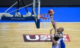 Gubernur DKI Jakarta Anies Baswedan memberikan ucapan selamat kedapa tim Basket Satria Muda Pertamina Jakarta usai memenangi laga final IBL 2021 di Britama Arena, Jakarta, Ahad (6/6). (FOTO : Republika/Thoudy Badai)