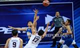 Pemain Basket Satria Muda Pertamina Jakarta Arki Dikania Wisnu (kanan) berusaha memasukan bola saat laga final IBL 2021 melawan Pelita Jaya Bakrie Jakarta di Britama Arena, Jakarta, Ahad (6/6). (FOTO : Republika/Thoudy Badai)