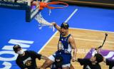 Pemain basket Satria Muda Pertamina Jakarta Hardianus Lakudu melepaskan jaring ring saat merayakan kemenangan melawan tim Pelita Jaya Bakrie Jakarta pada laga final IBL 2021 di Britama Arena, Jakarta, Ahad (6/6). (FOTO : Republika/Thoudy Badai)