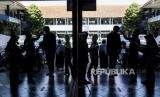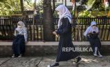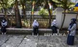 Siswa Sekolah Menengah Pertama (SMP) menunggu jemputan usai mengikuti Penilaian Akhir Tahun (PAT) secara tatap muka di SMP Pasundan 1, Jalan Balonggede, Kota Bandung, Senin (7/6). SMP Pasundan 1 menggelar Penilaian Akhir Tahun (PAT) yang bertepatan dengan uji coba Pembelajaran Tatap Muka (PTM) terbatas yang dilakukan Pemerintah Kota Bandung dengan menerapkan protokol kesehatan Covid-19 secara ketat, seperti membatasi jumlah siswa menjadi 20 persen dari kapasitas, menerapkan jarak duduk dan menggunakan masker. (FOTO : REPUBLIKA/ABDAN SYAKURA)