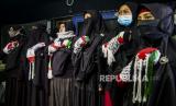 Sejumlah peserta menggulung syal Indonesia Palestina di tangan saat mengucapkan sumpah pada acara peringatan 54 tahun pendudukan Al-Aqsha oleh zionis Israel di AQL Islamic Center, Tebet, Jakarta, Senin (7/6). Pada peringatan yang dihadiri oleh tokoh ulama beserta pemuda yang tergabung dalam Koalisi Indonesia Bebaskan Baitul Maqdis (KIBBM) itu mendeklarasikan Sumpahku Untuk Al-Aqsha. Republika/Putra M. Akbar (FOTO : Republika/Putra M. Akbar)