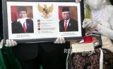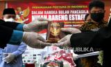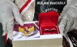 Maskawin yang diberikan usai ijab qobul pasangan pengantin difabel Mujiono dan Dewi Susilowati saat Nikah Bareng Estafet di KUA Sewon, Bantul, Yogyakarta, Selasa (8/6). Nikah Bareng ini diadakan berbarengan dengan bulan Hari Lahir Pancasila. Ada lima pasangan yang mengikuti acara ini dan salah satunya pasangan pengantin difabel. Maskawin pengantin yang diberikan yakni gambar Garuda Pancasila. (FOTO : Wihdan Hidayat / Republika)