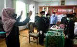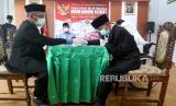 Proses ijab qobul pasangan pengantin difabel Mujiono dan Dewi Susilowati saat Nikah Bareng Estafet di KUA Sewon, Bantul, Yogyakarta, Selasa (8/6). Nikah Bareng ini diadakan berbarengan dengan bulan Hari Lahir Pancasila. Ada lima pasangan yang mengikuti acara ini dan salah satunya pasangan pengantin difabel. Maskawin pengantin yang diberikan yakni gambar Garuda Pancasila. (FOTO : Wihdan Hidayat / Republika)