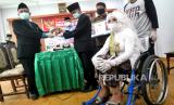 Penyerahan buku nikah ke lasangan pengantin difabel Mujiono dan Dewi Susilowati usai menjalani ijab qobul saat Nikah Bareng Estafet di KUA Sewon, Bantul, Yogyakarta, Selasa (8/6). Nikah Bareng ini diadakan berbarengan dengan bulan Hari Lahir Pancasila. Ada lima pasangan yang mengikuti acara ini dan salah satunya pasangan pengantin difabel. Maskawin pengantin yang diberikan yakni gambar Garuda Pancasila. (FOTO : Wihdan Hidayat / Republika)