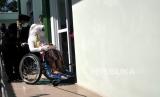 Pasangan pengantin difabel Mujiono dan Dewi Susilowati usai menjalani ijab qobul saat Nikah Bareng Estafet di KUA Sewon, Bantul, Yogyakarta, Selasa (8/6). Nikah Bareng ini diadakan berbarengan dengan bulan Hari Lahir Pancasila. Ada lima pasangan yang mengikuti acara ini dan salah satunya pasangan pengantin difabel. Maskawin pengantin yang diberikan yakni gambar Garuda Pancasila. (FOTO : Wihdan Hidayat / Republika)