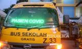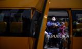 Pasien covid-19 menaiki bus khusus pasien untuk dibawa ke Rumah Sakit Darurat Covid-19 (RSDC) Wisma Atlet di Puskesmas Kecamatan Pasar Minggu, Jakarta, Selasa (8/6). Berdasarkan data dari Satuan Tugas Penanganan Covid-19 Jumlah pasien di Indonesia pada Selasa 8 Juni 2021 mengalami kenaikan sebanyak 6.294 orang dengan jumlah total kasus positif covid-19 mencapai 1.869.325 orang. (FOTO : Republika/Thoudy Badai)