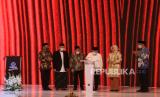 Wakil Presiden Ma’ruf Amin (ketiga kanan) didampingi Menteri Ketenagakerjaan Ida Fauziyah (kedua kanan), Ketua Dewan Komisioner OJK Wimboh Santoso (kiri), Gubernur Jawa Barat Ridwan Kamil (kanan), Wakil Ketua DPR Muhaimin Iskandar (ketiga kiri) dan Pimpinan Pondok Pesantren Cipasung KH. Bunyamin Ruhiat meresmikan Bank Wakaf Mikro (BWM) dan Balai Latihan Kerja di Pondok Pesantren Cipasung, Tasikmalaya, Jawa Barat, Selasa (8/6/2021). Pendirian BWM terus dilakukan OJK bersama pemerintah untuk mendorong pengembangan usaha mikro syariah serta pemberdayaan masyarakat sekitar pesantren. (FOTO : ANTARA/HUMAS OJK)